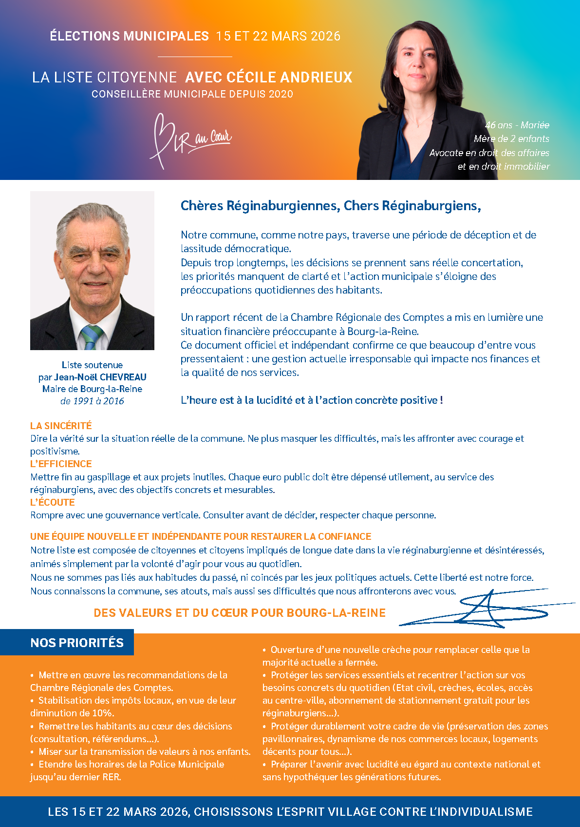 Agissons ensemble pour (re)connecter Bourg-la-Reine à l’esprit Village : une ville dynamique, sûre dans ses quartiers, attentive aux enfants comme aux aînés, ouverte et bienveillante envers tous, et pleinement engagée pour préserver notre environnement.